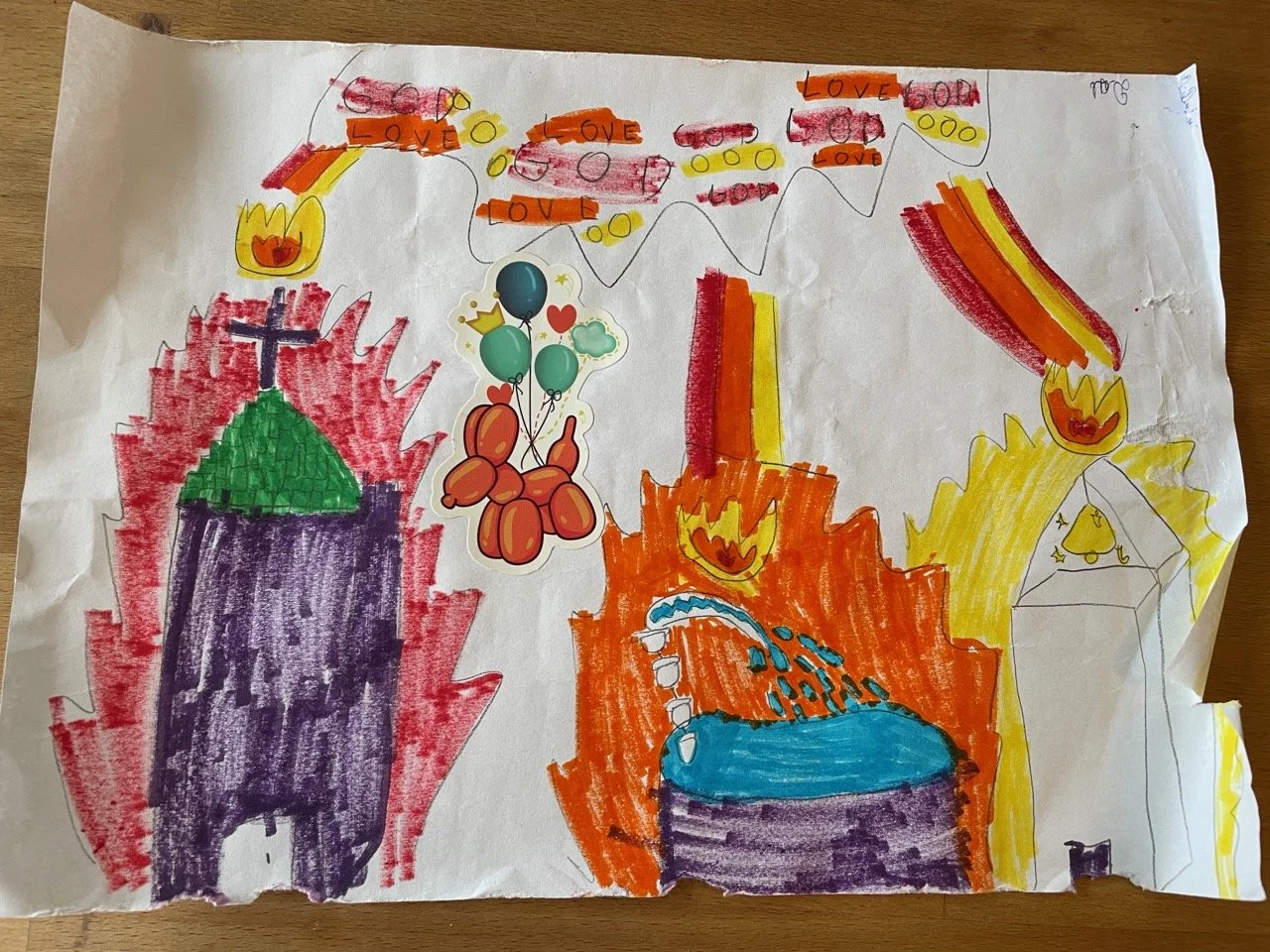 Kite made in Sunday school. “Don’t worry, but always ask God what you need.” and “Love God with all my heart.”