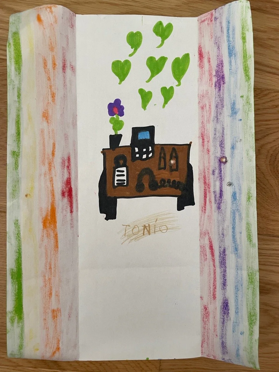 Opens to Papa’s desk. Her attention to detail is so fun, the head phones, computer, notepad…