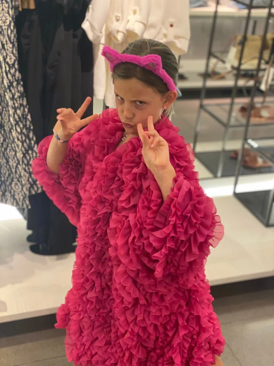 Rowyn embracing the pink frills, kitty ears and peace signs.