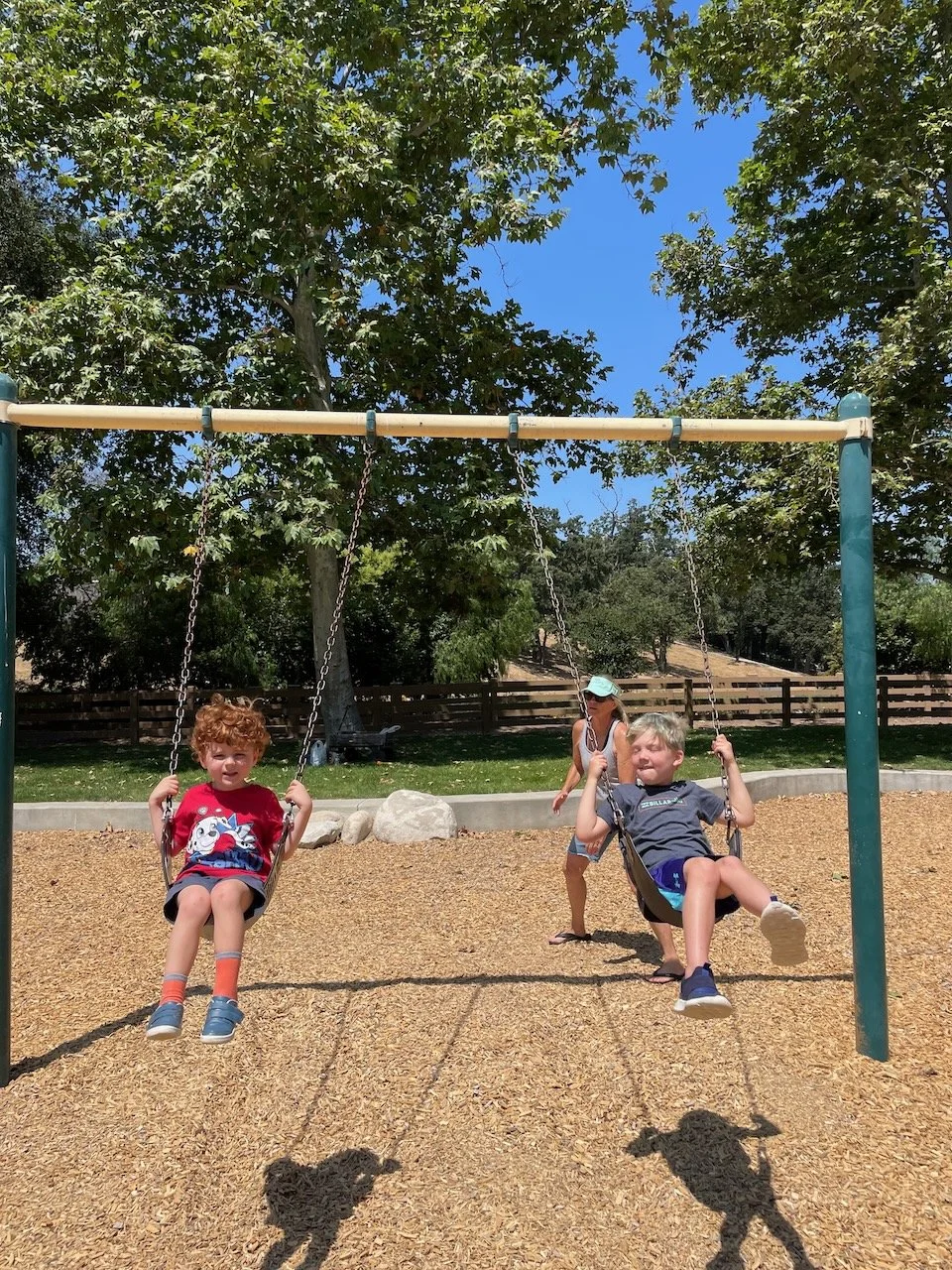 Grandma Kathy pushes Django and Rowdy on the swings.