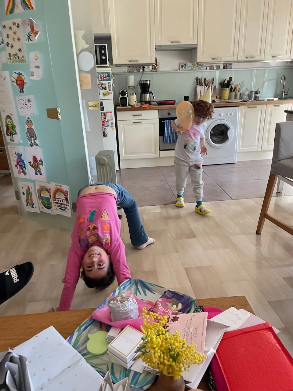 My two treasures. Daphné and I didn’t plan our matching pink and jeans, but we love it! And did you see Django’s crocs?