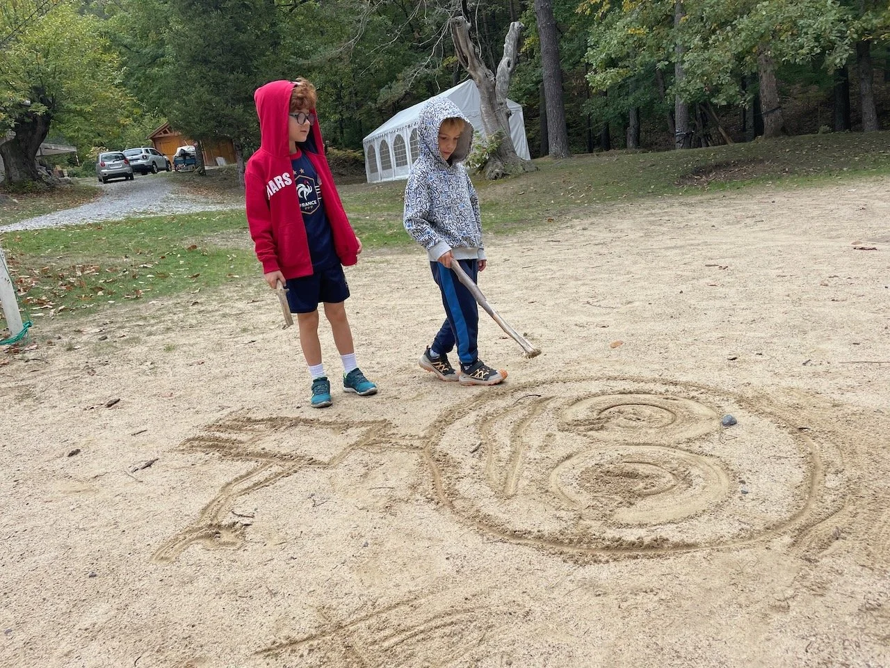 Django and Eliot drawing in the sand.