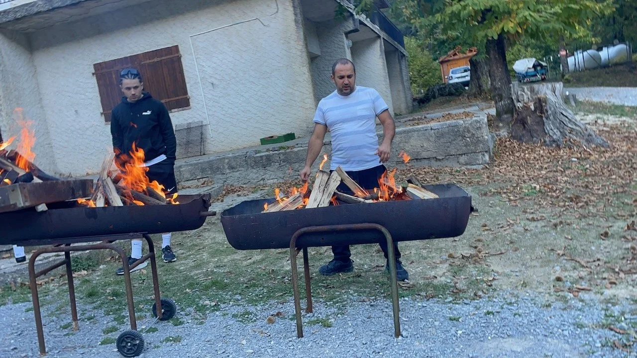 Hadrien and Eliot feeding the fire.