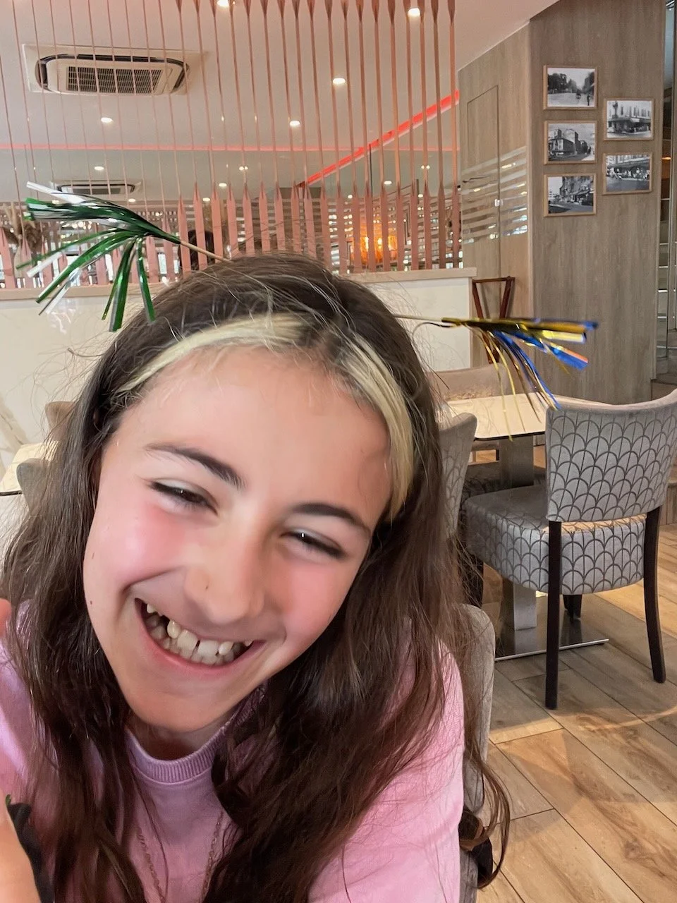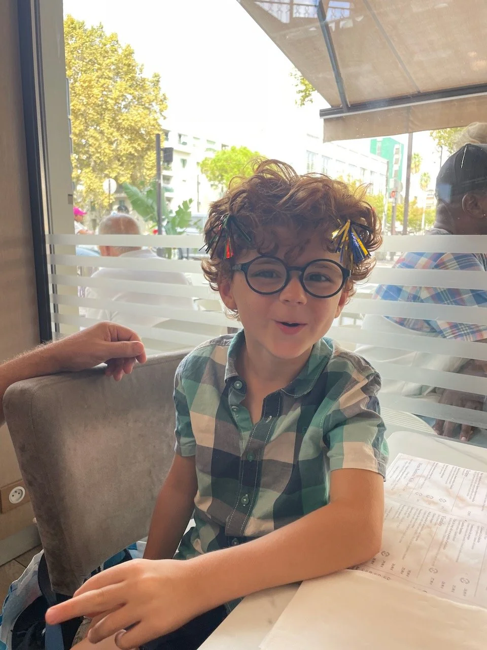 We went to a restaurant after to celebrate. The waiter put little pompoms in Daphné’s hair.