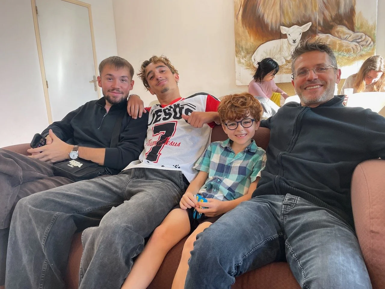 Django with the big boys at church : Mathis, Yohan and Fernando.