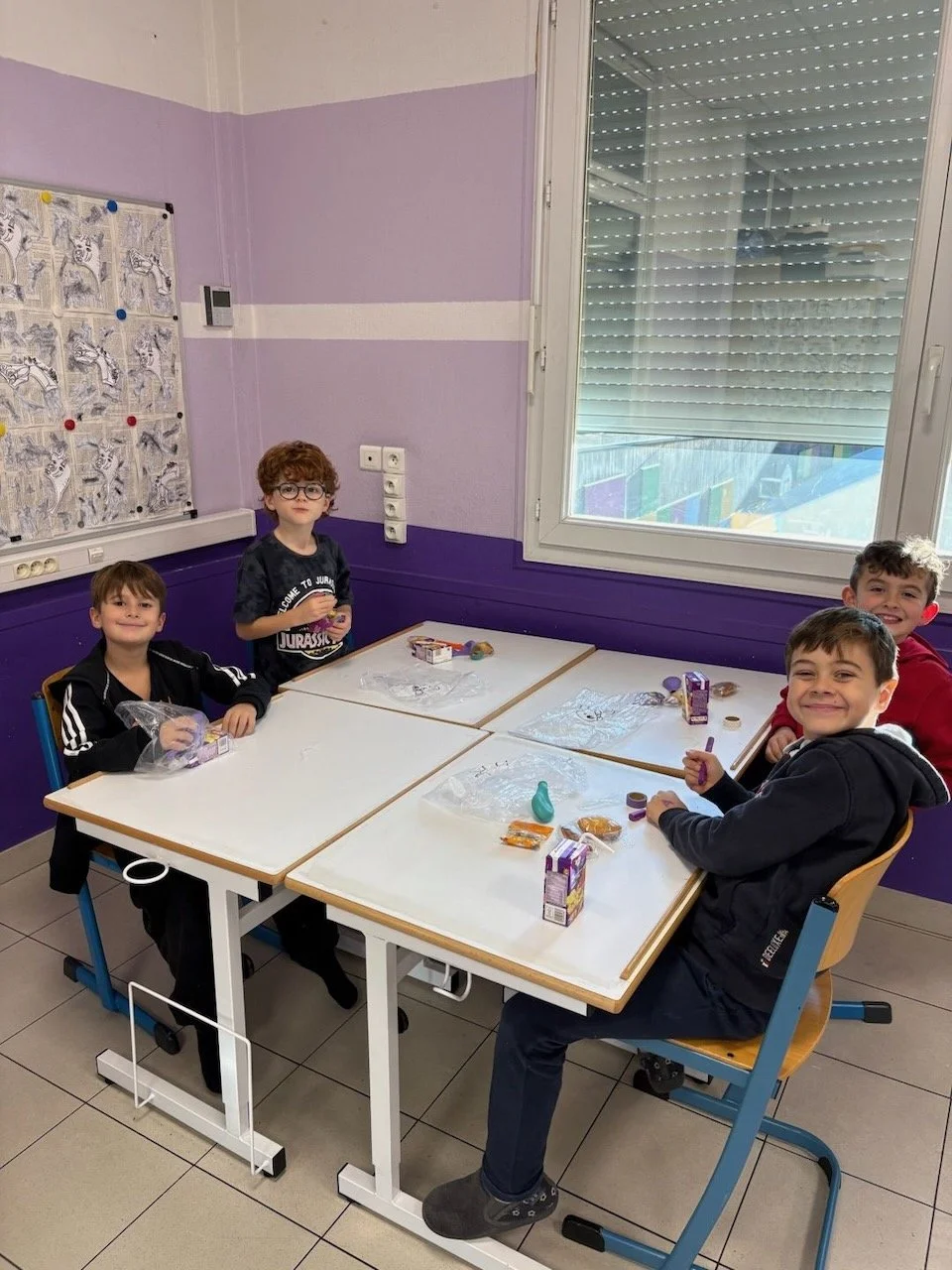 Django in class with some of his friends, Mathieu, Aaron and Amaury.