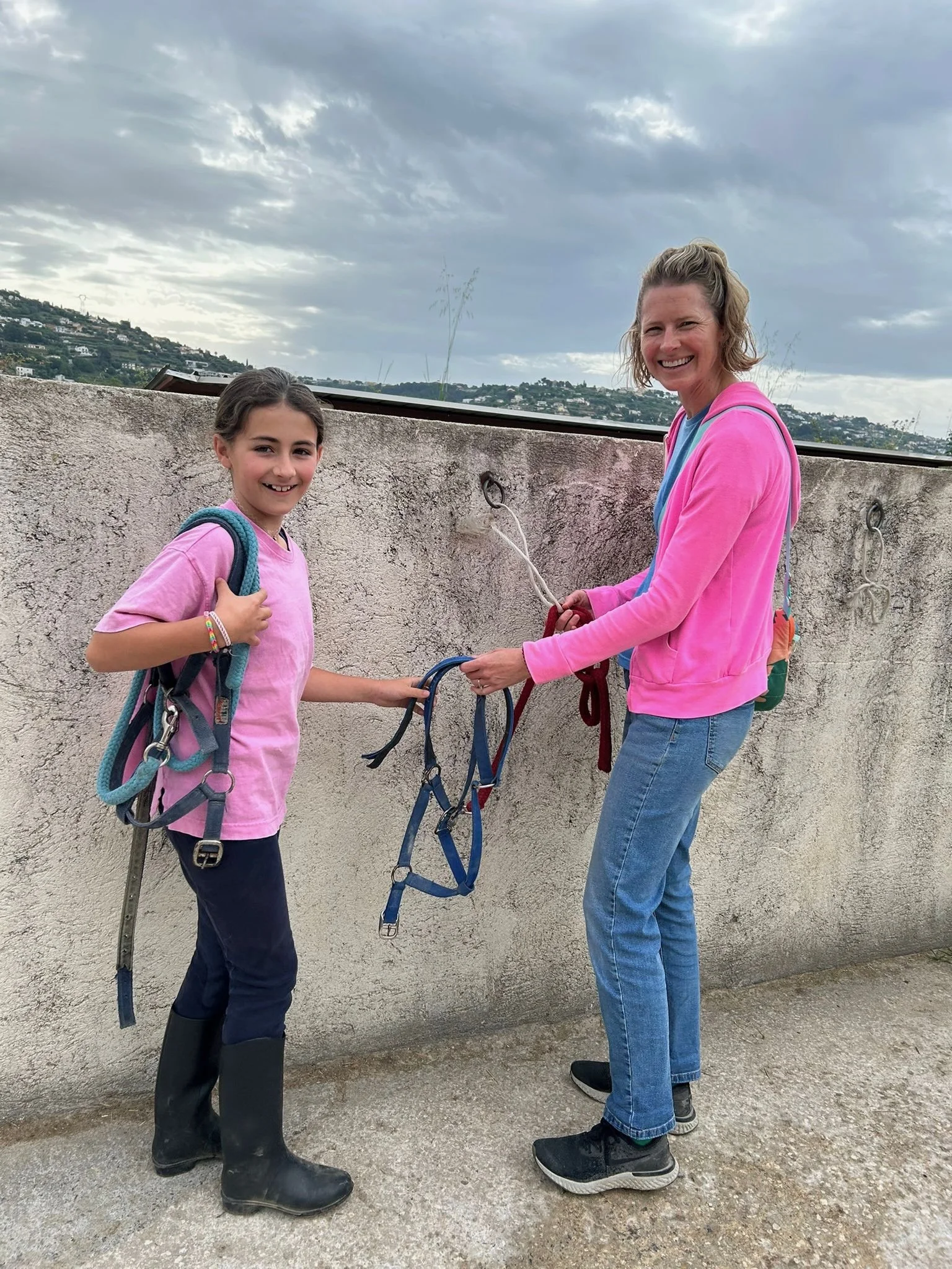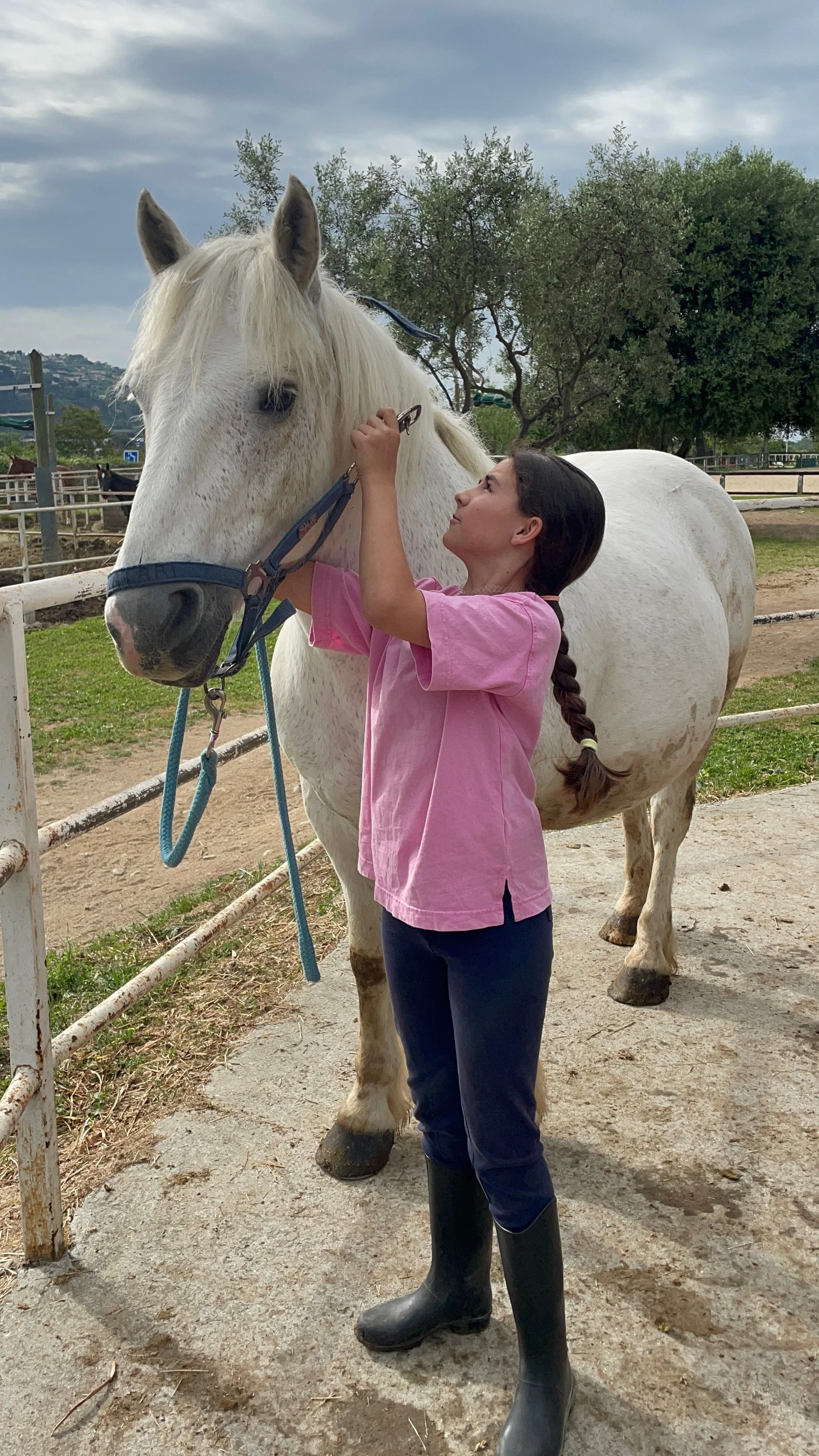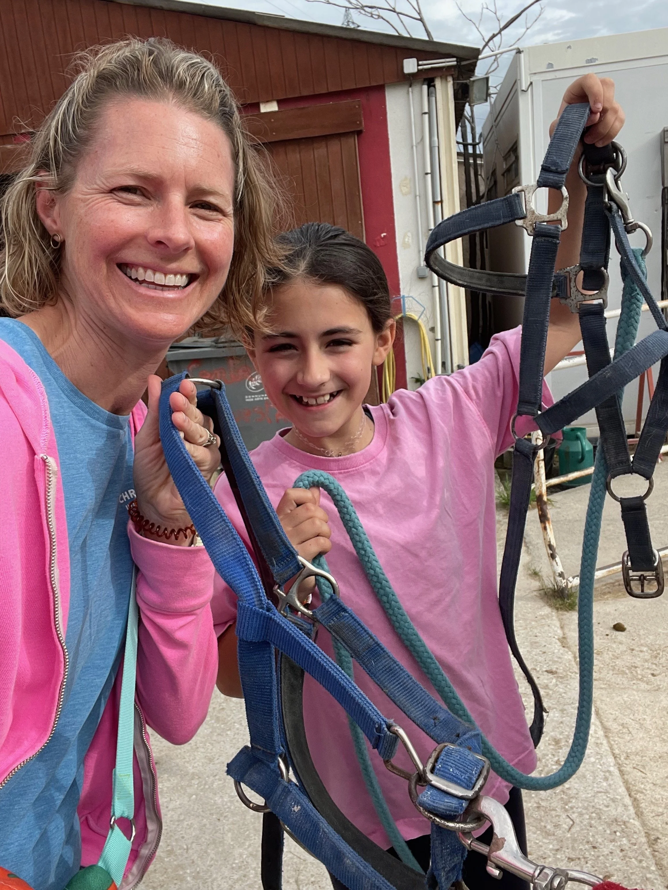 Daphné teaching me how to tie the slip knot on the halter lead.