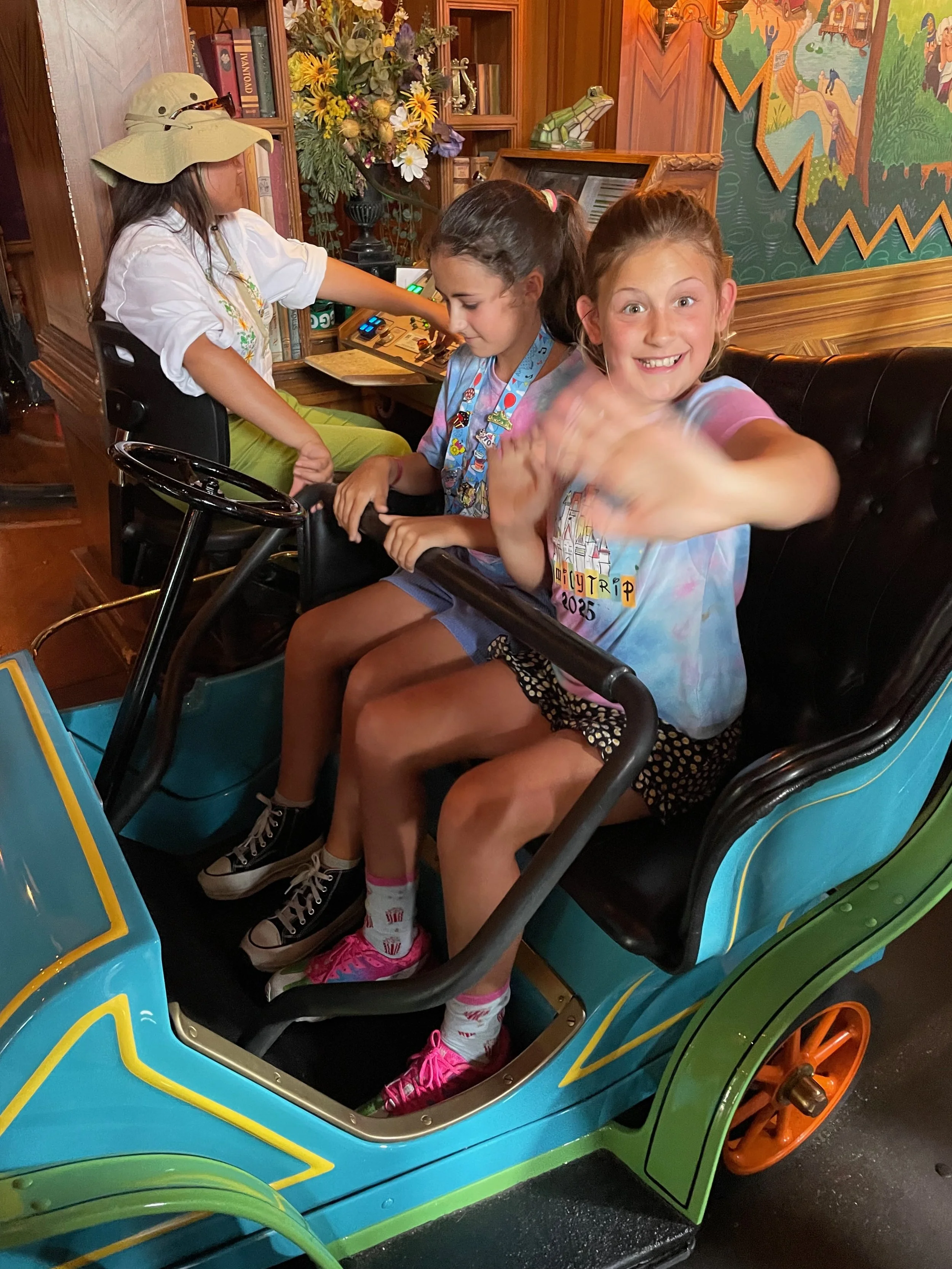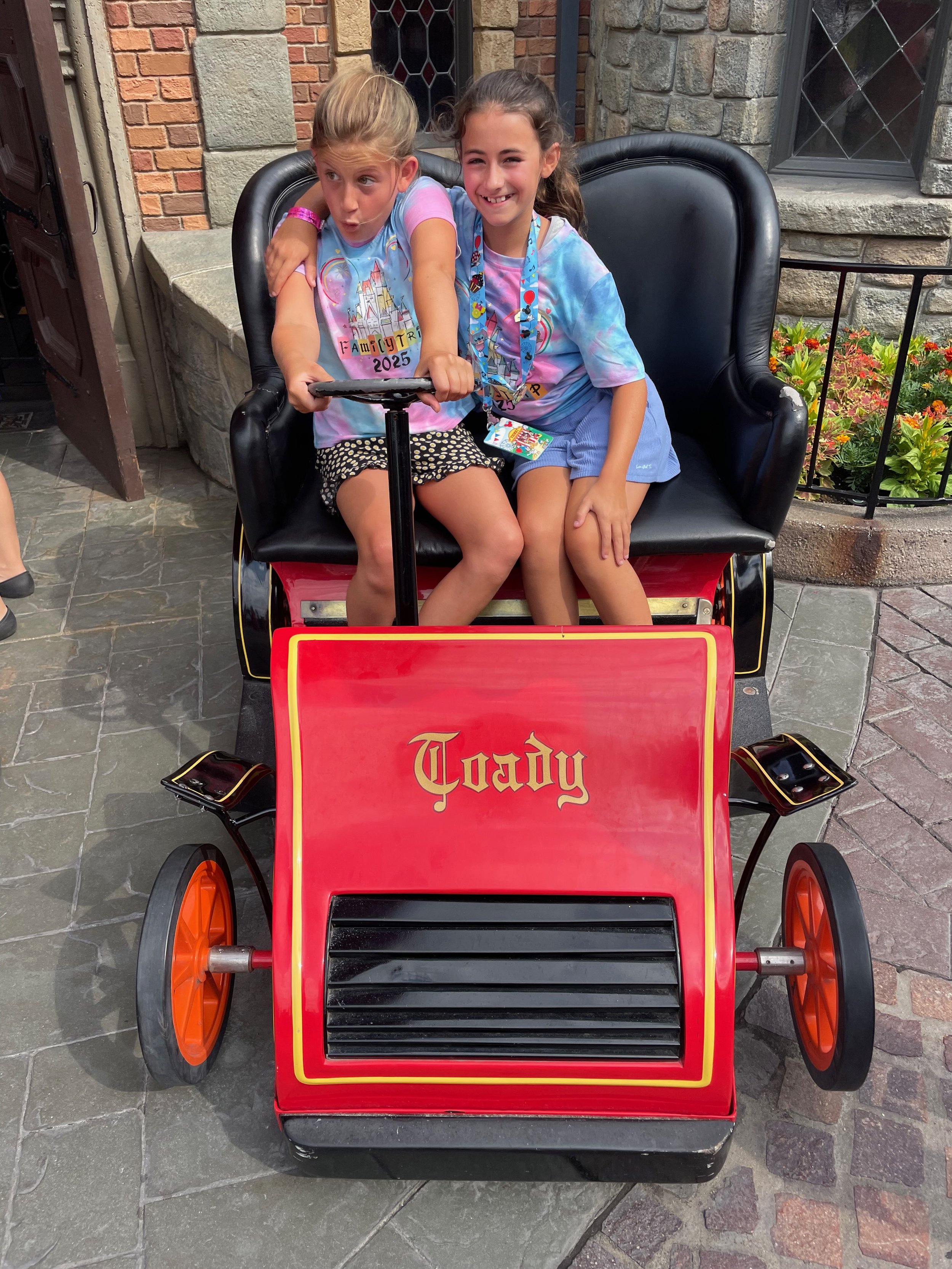 Daphné and Rowyn ready for a wild ride with Mr. Toad.