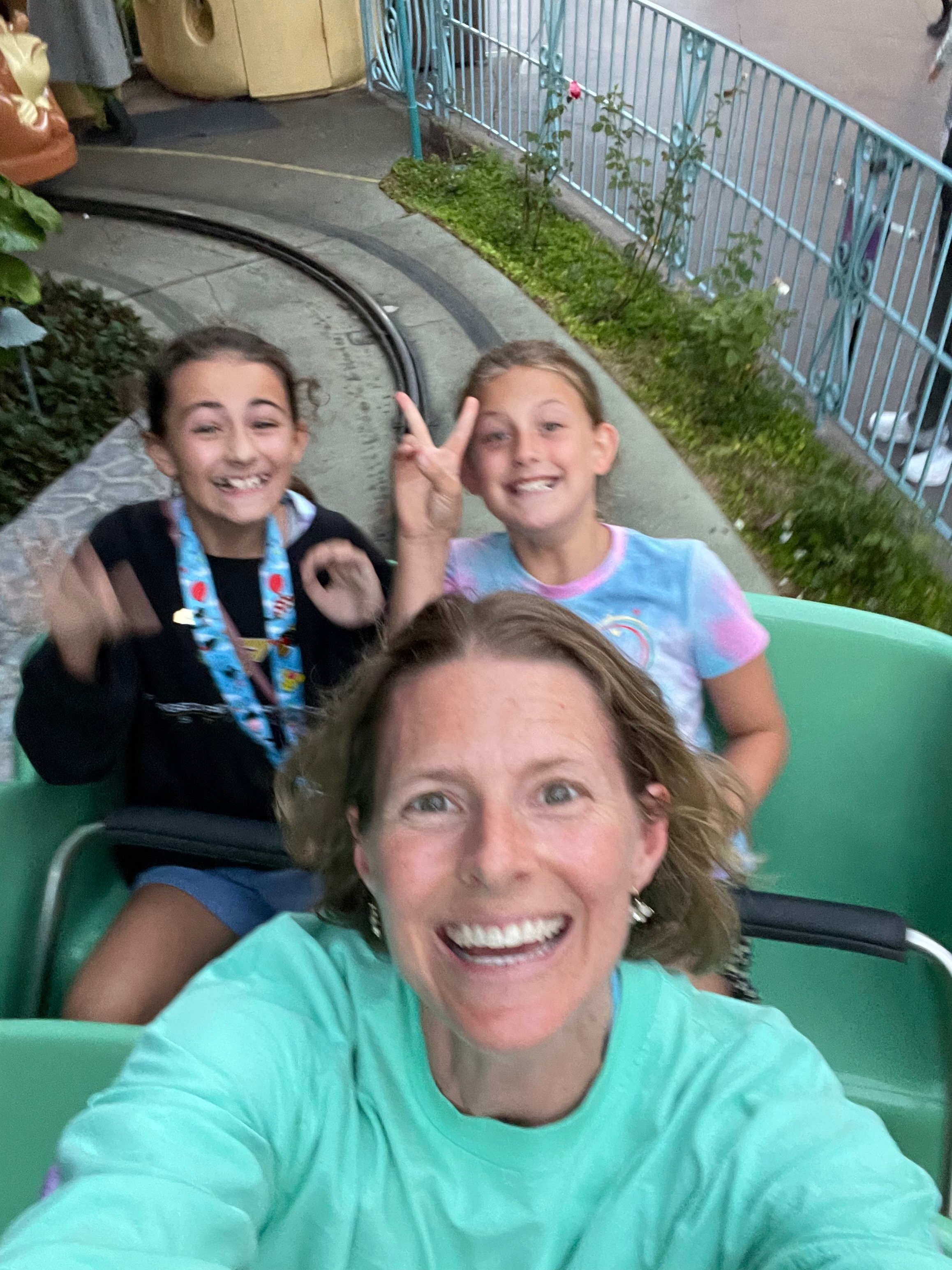 And the last photo of the day, a blurry ride on Alice in Wonderland. We had fun and were ready to head back to the hotel to get in the pool and hot tub. We signed off at 8pm, but the park stayed open until midnight. Yowzers!