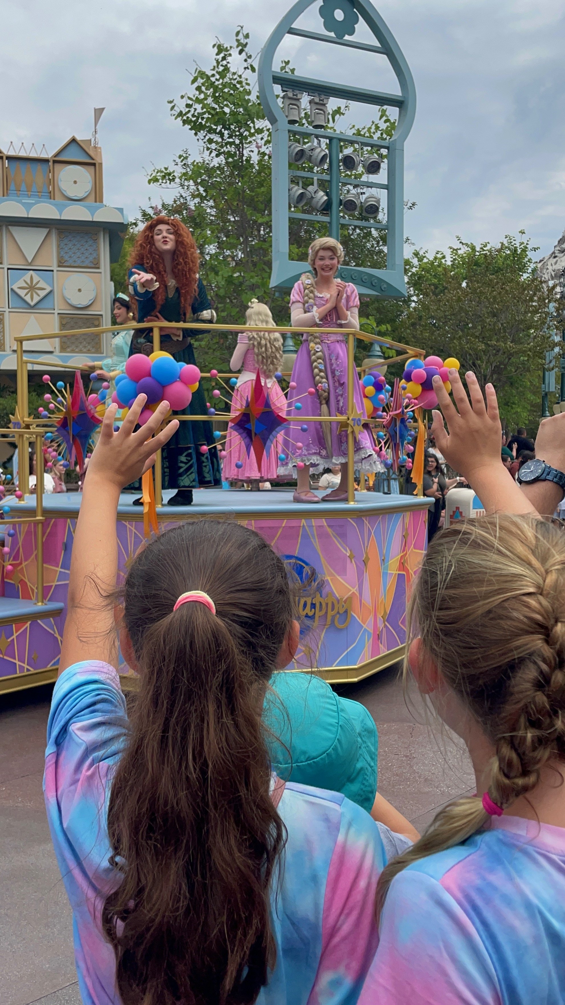 Merida from Brave blowing a kiss to Daphné and Rowyn. Rapunzel, Jasmine and Sleeping Beauty are also on the float.