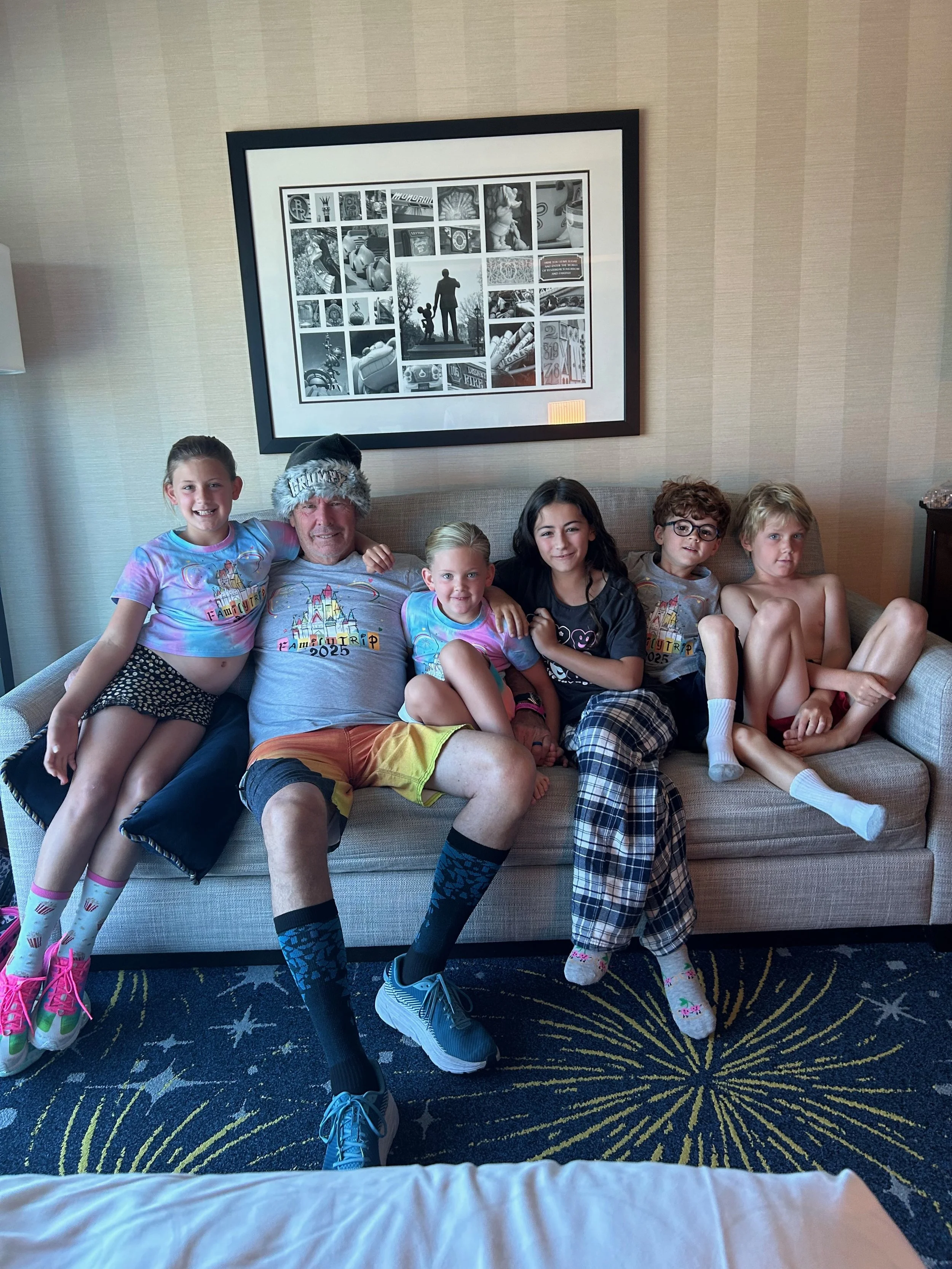 Some of the cousins in the morning in the hotel with Grandpa Tim, who is wearing his Grumpy hat.