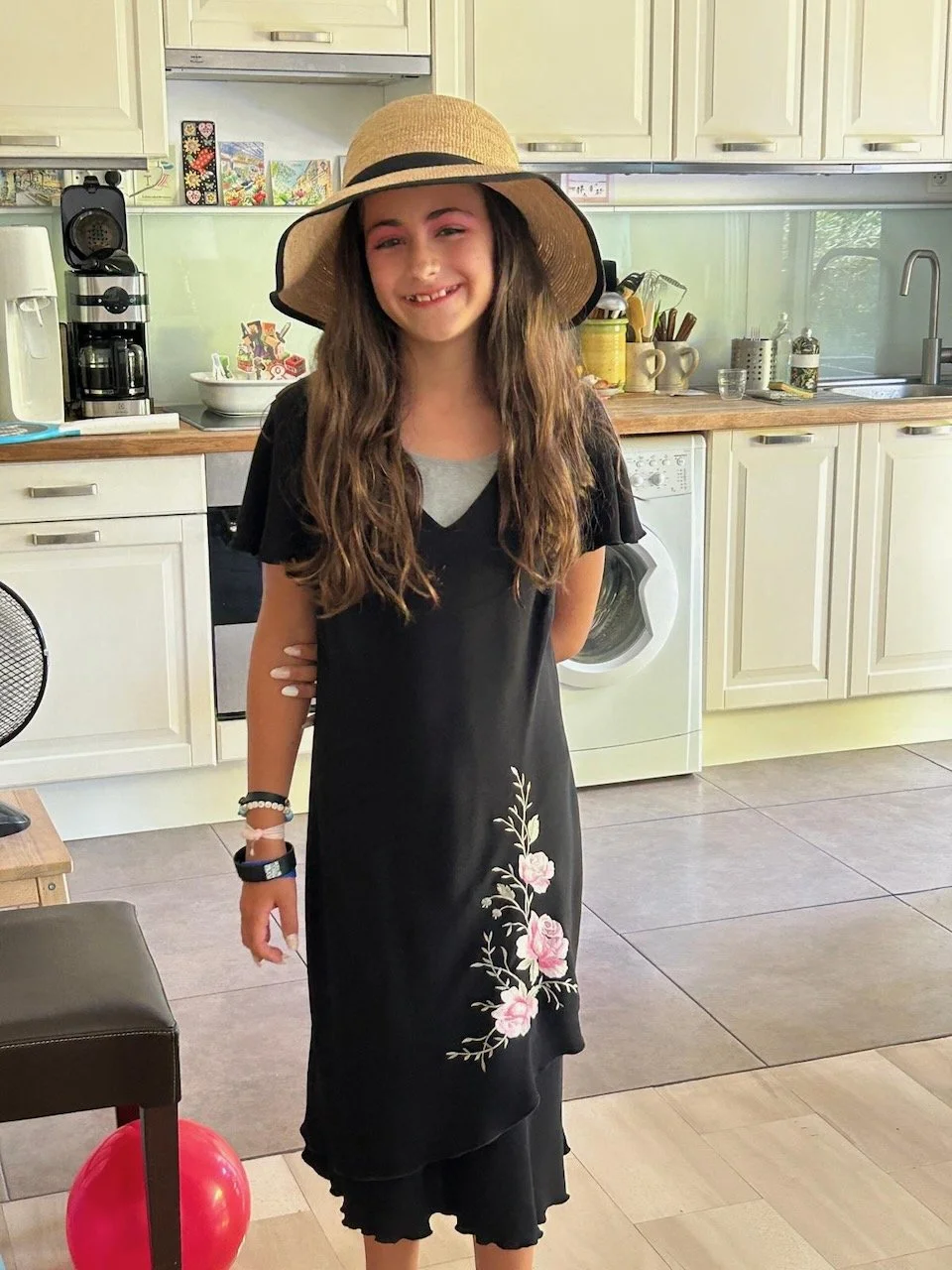 Fancy girl ready for a party, wearing fake nails and Cricri’s hat.