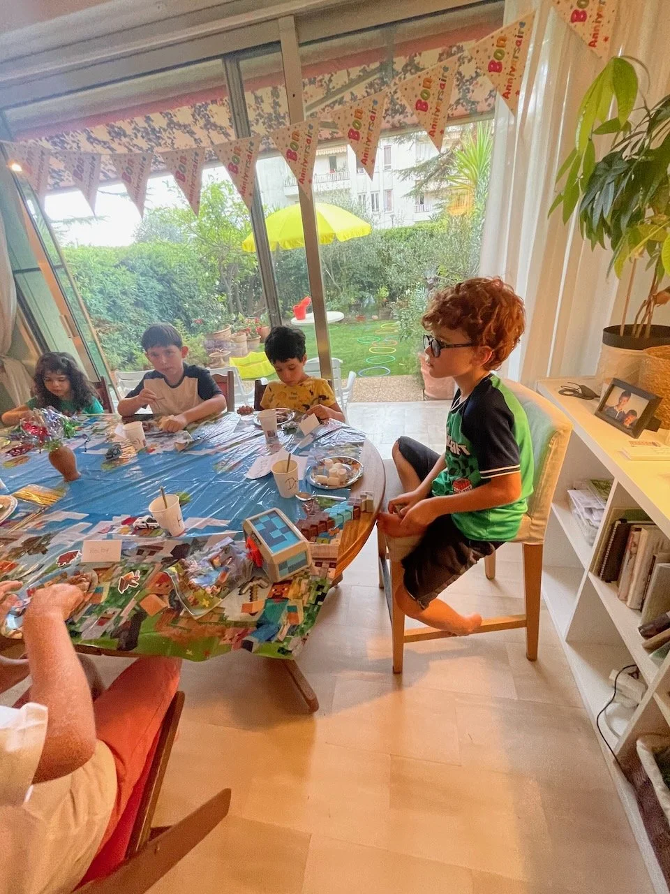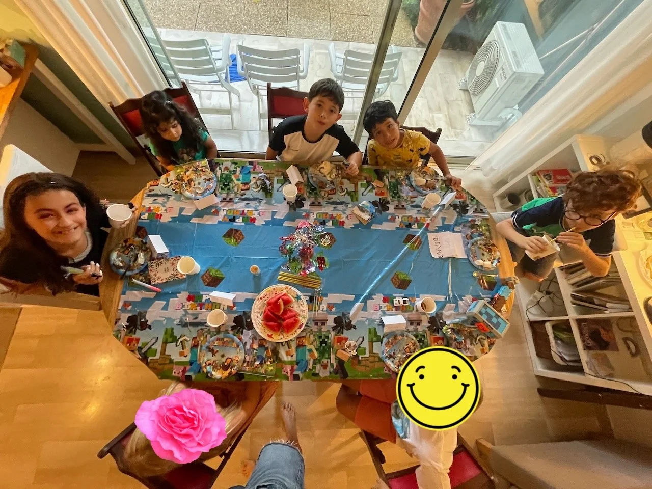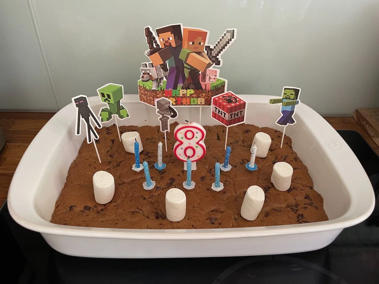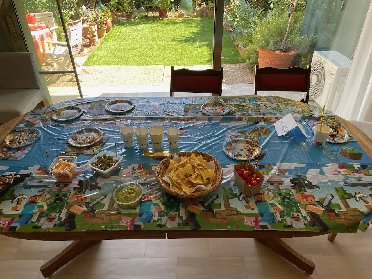 Minecraft theme this year. Thank you Pierre and Nancy for allowing us to have the party at your air-conditioned home with a yard!