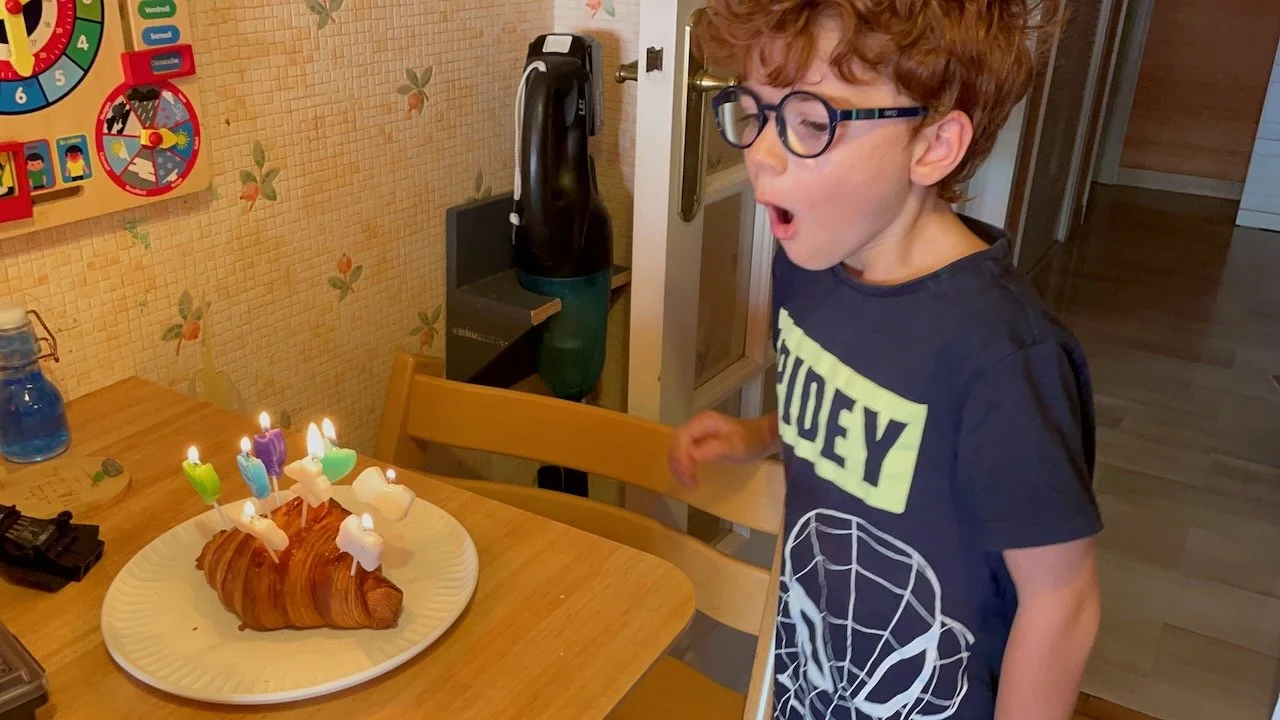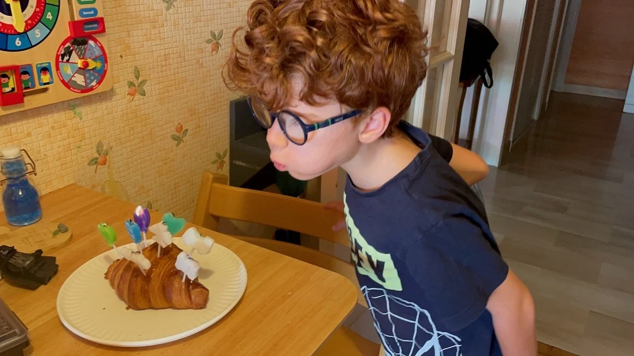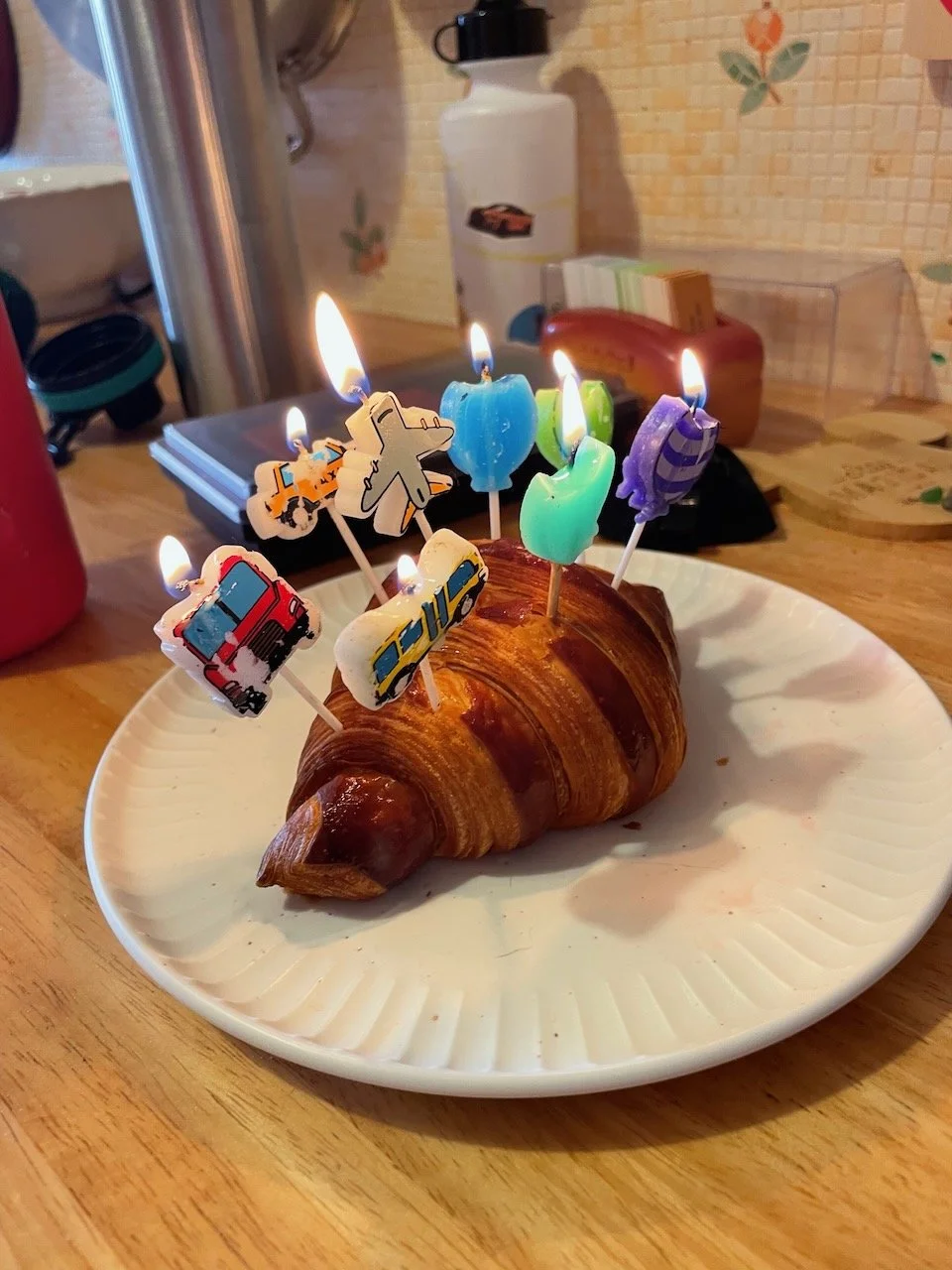 He loves croissants, so naturally an easy birthday breakfast choice. I’m so glad I bought two, because the wax melted on this one. Django wanted a non-wax croissant - haha.