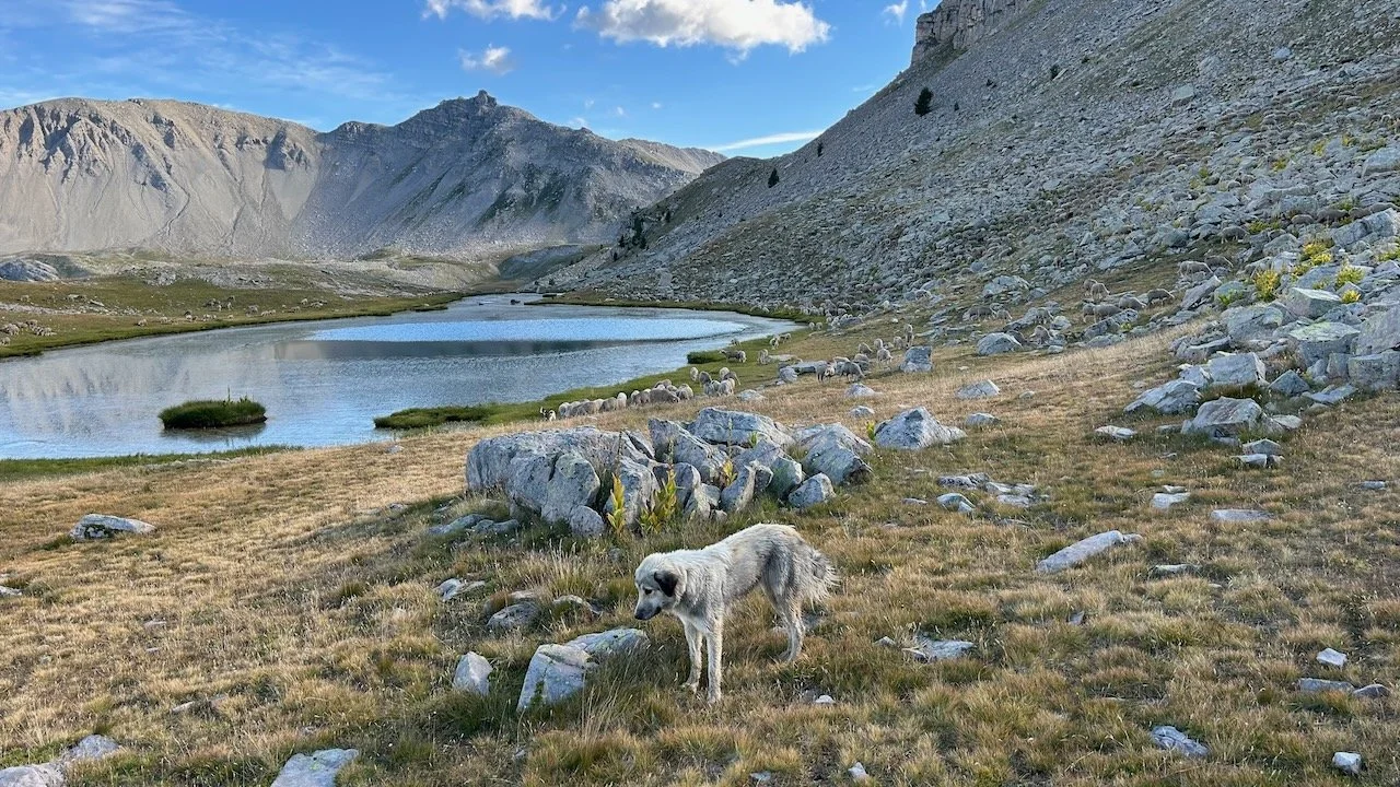 These dogs are called “patou” which is a sheep dog, usually the breed Pyrenees Mountain dog. They can also be Anatolian Shepherd dogs. They are often quite big, as you can see here.