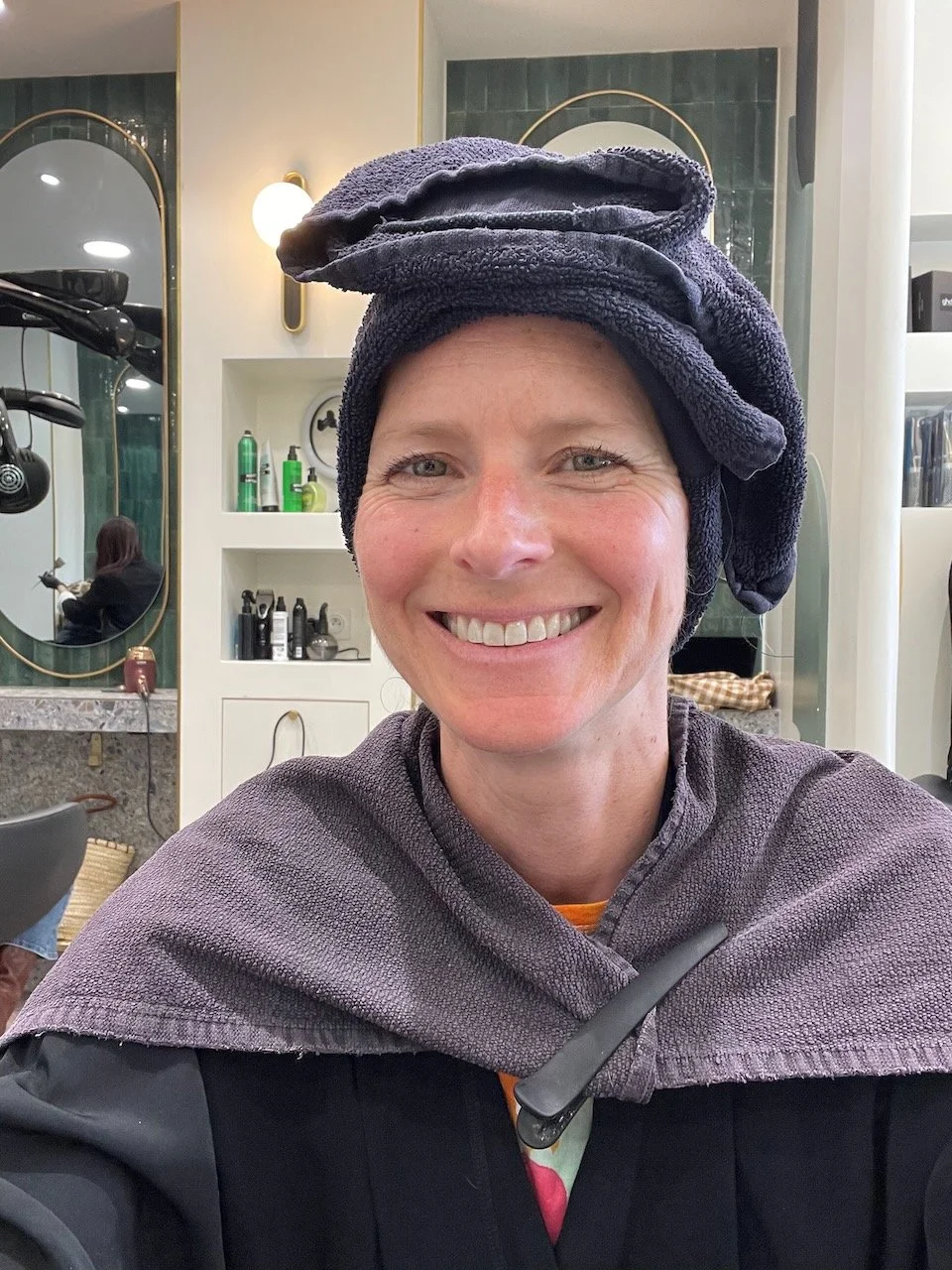 Another before with a fancy robe from the salon, Identity Hair Design.